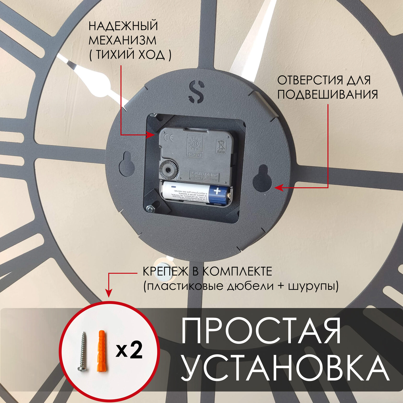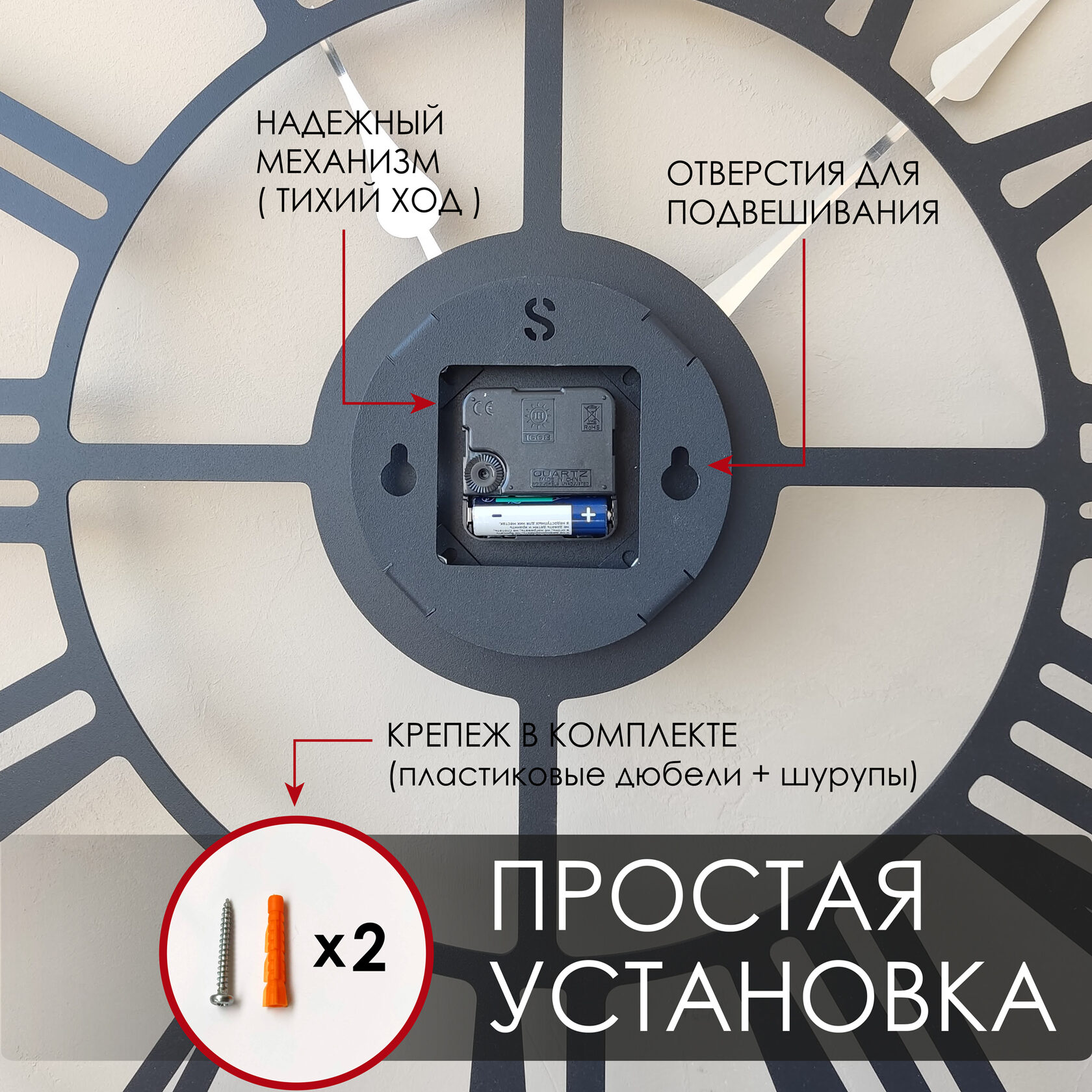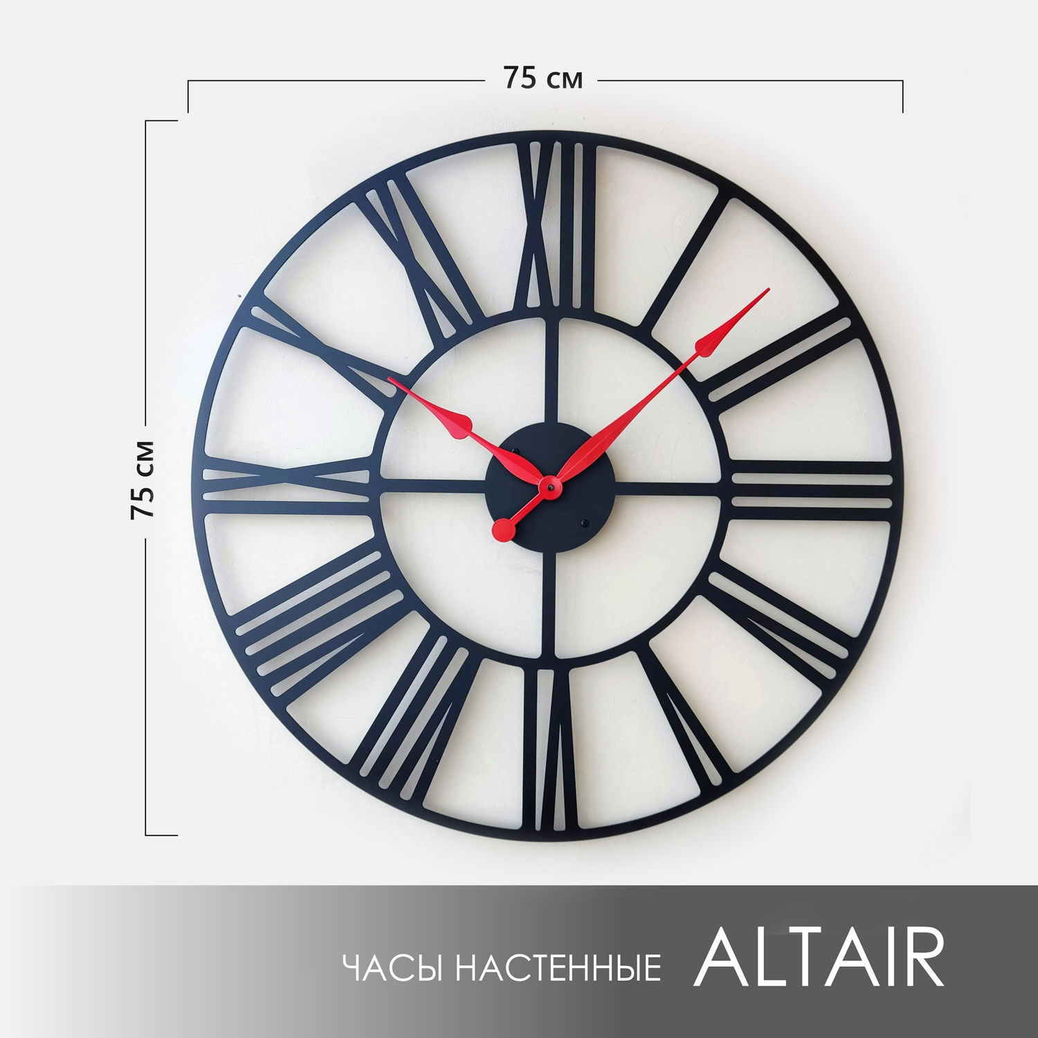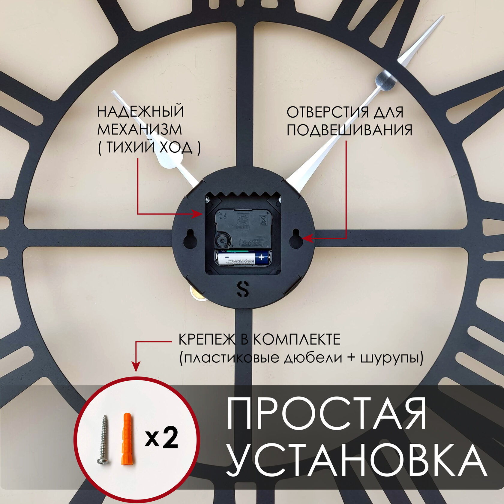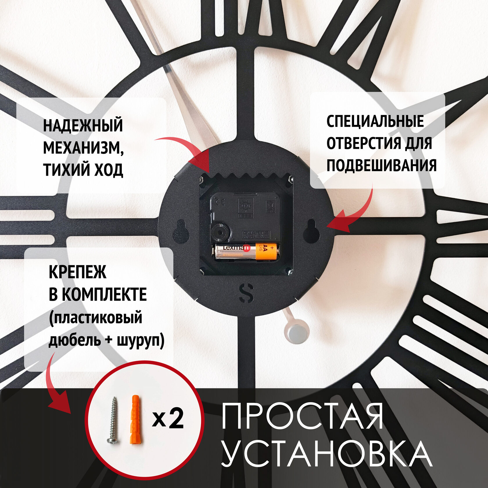 Эти большие настенные часы изготовлены из металла и окрашены экологичной порошковой краской. Они станут стильным домашним предметом интерьера, подчеркивающим красоту пространств, будь то лофт, минимализм, хай-тек, классика, модерн или дизайнерские интерьеры. Необычные большие настенные часы идеально подойдут в качестве подарка. На часах установлен надежный тихий механизм с плавным ходом, работающий от батарейки АА. Все права защищены и принадлежат правообладателю