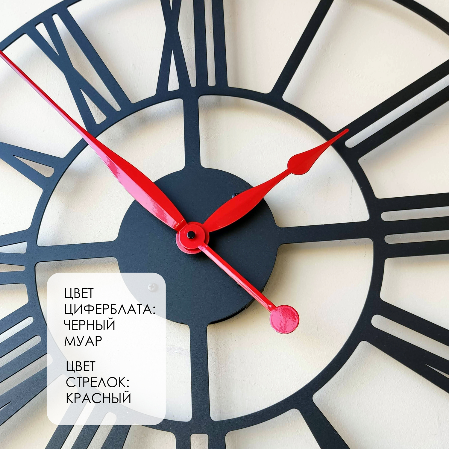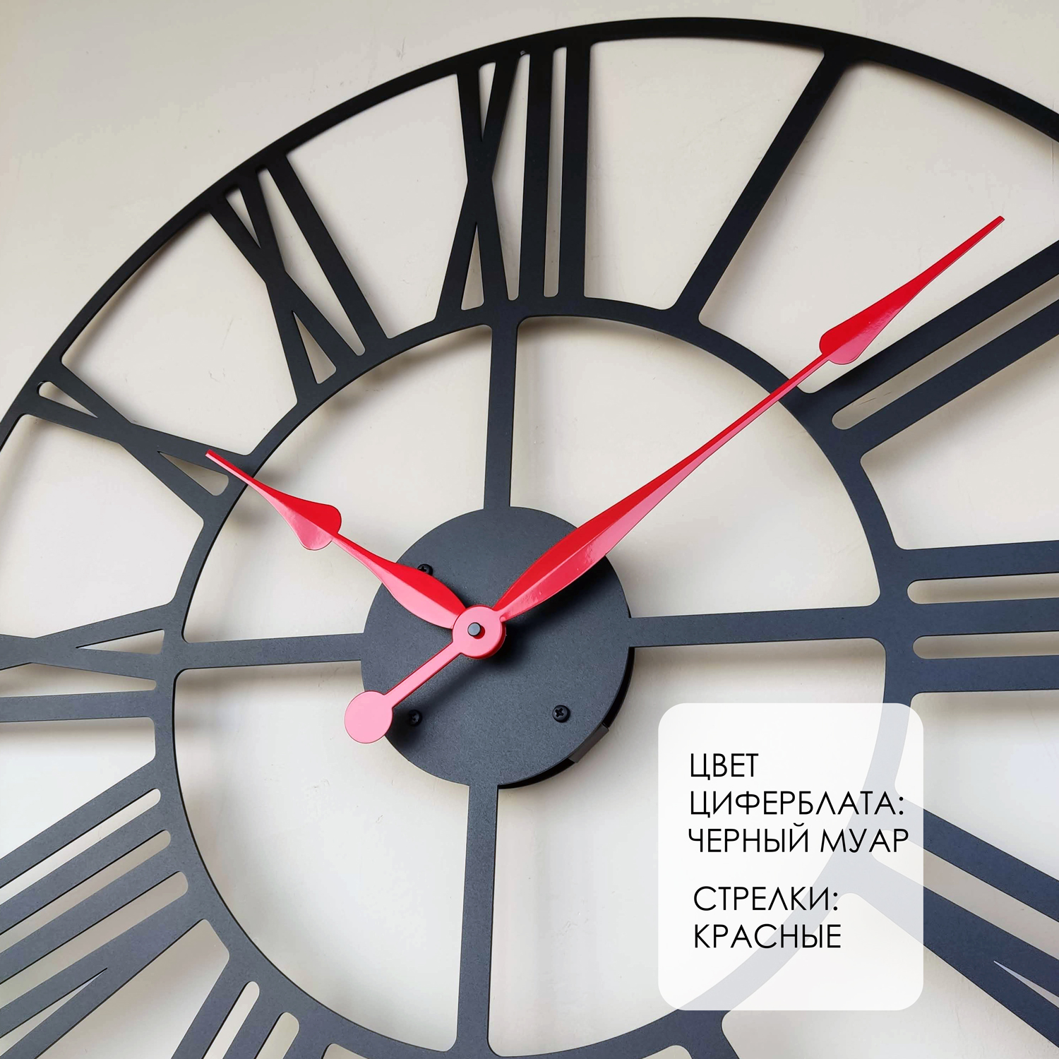Большие настенные часы из металла Размер: 75х75 см Цвет циферблата: черный муар Цвет стрелок: красный