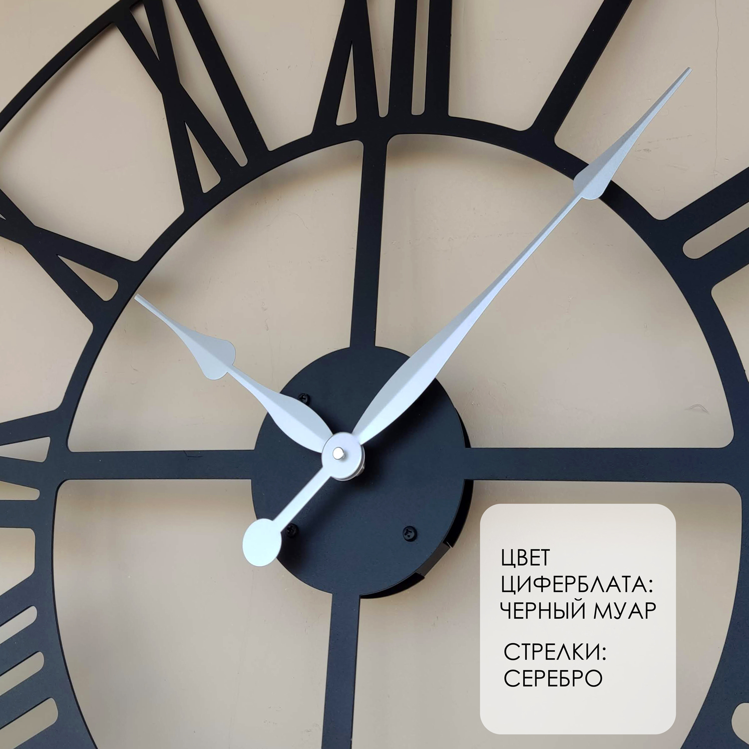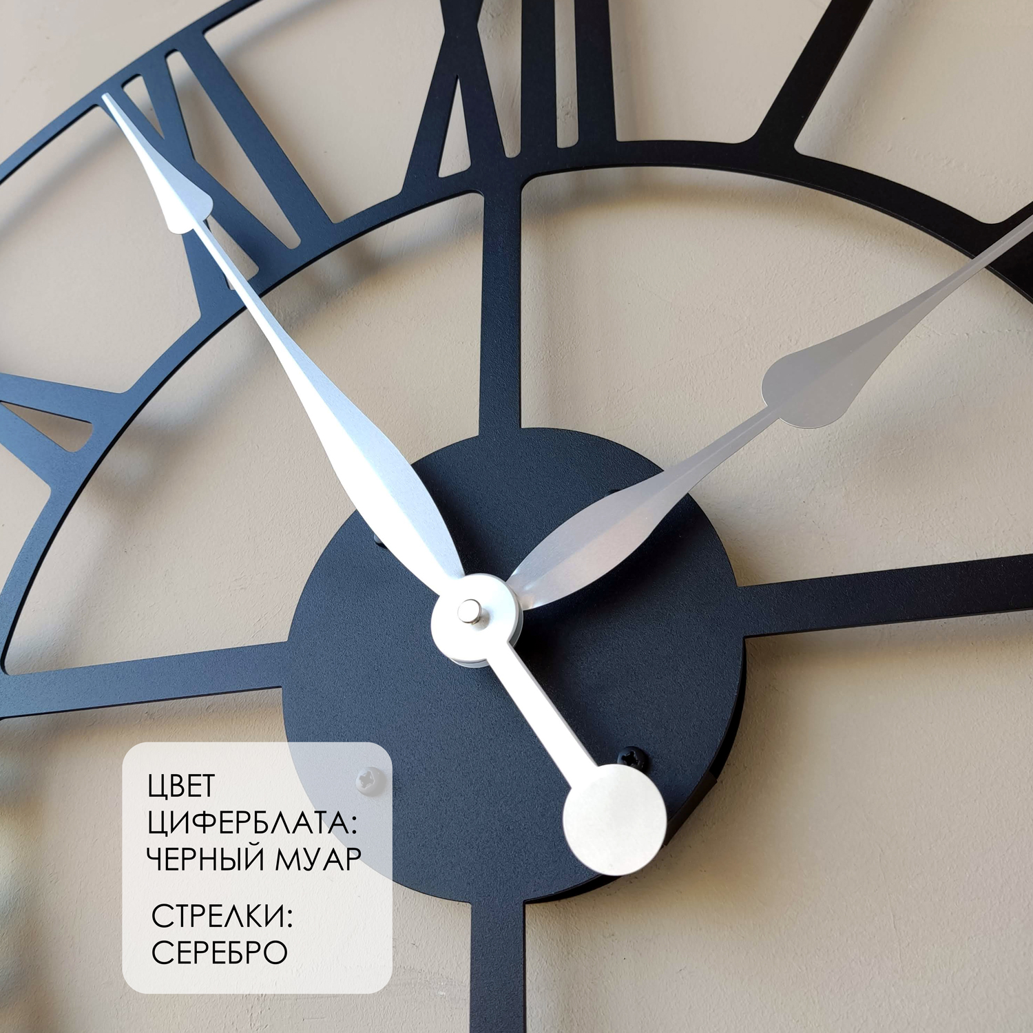 Большие настенные часы из металла Размер: 90х90 см Цвет циферблата: черный муар Цвет стрелок: серебро