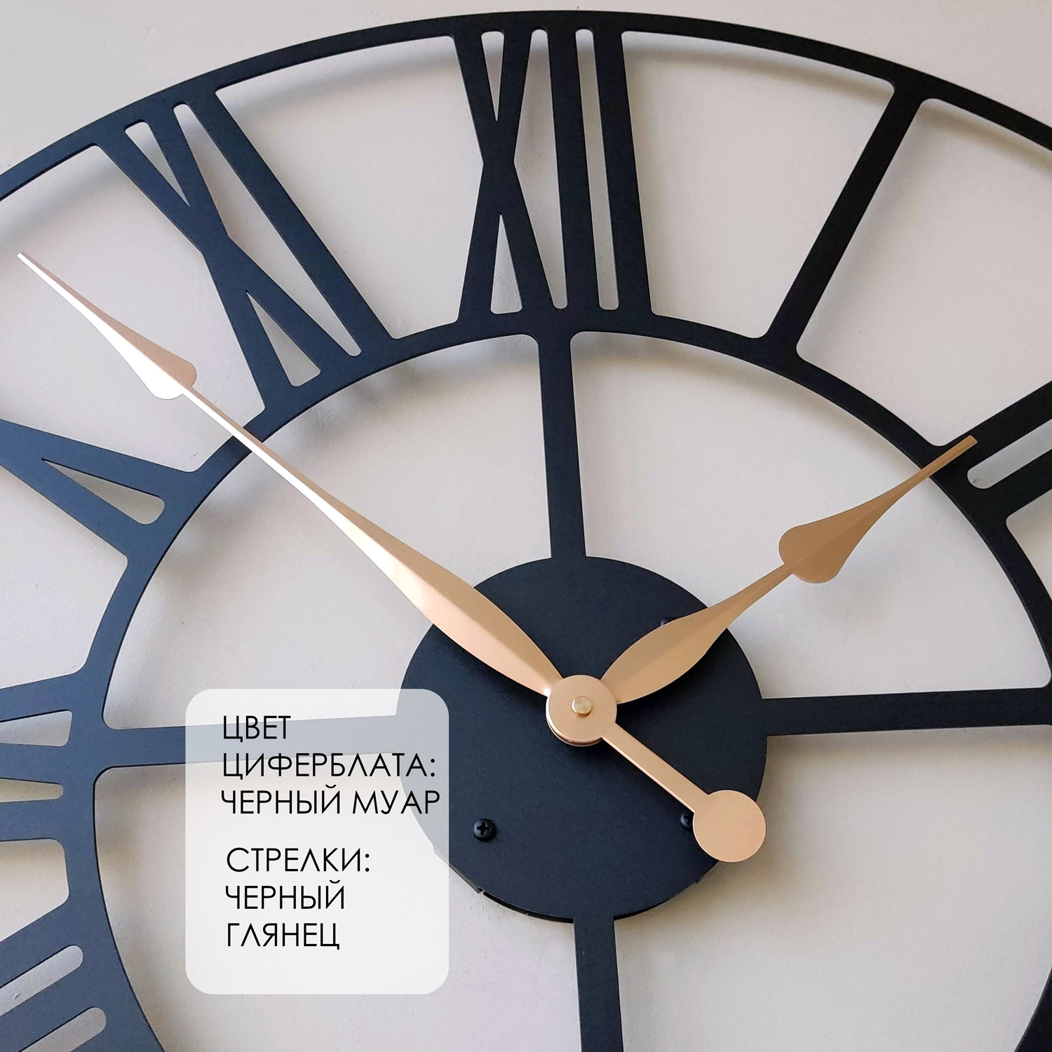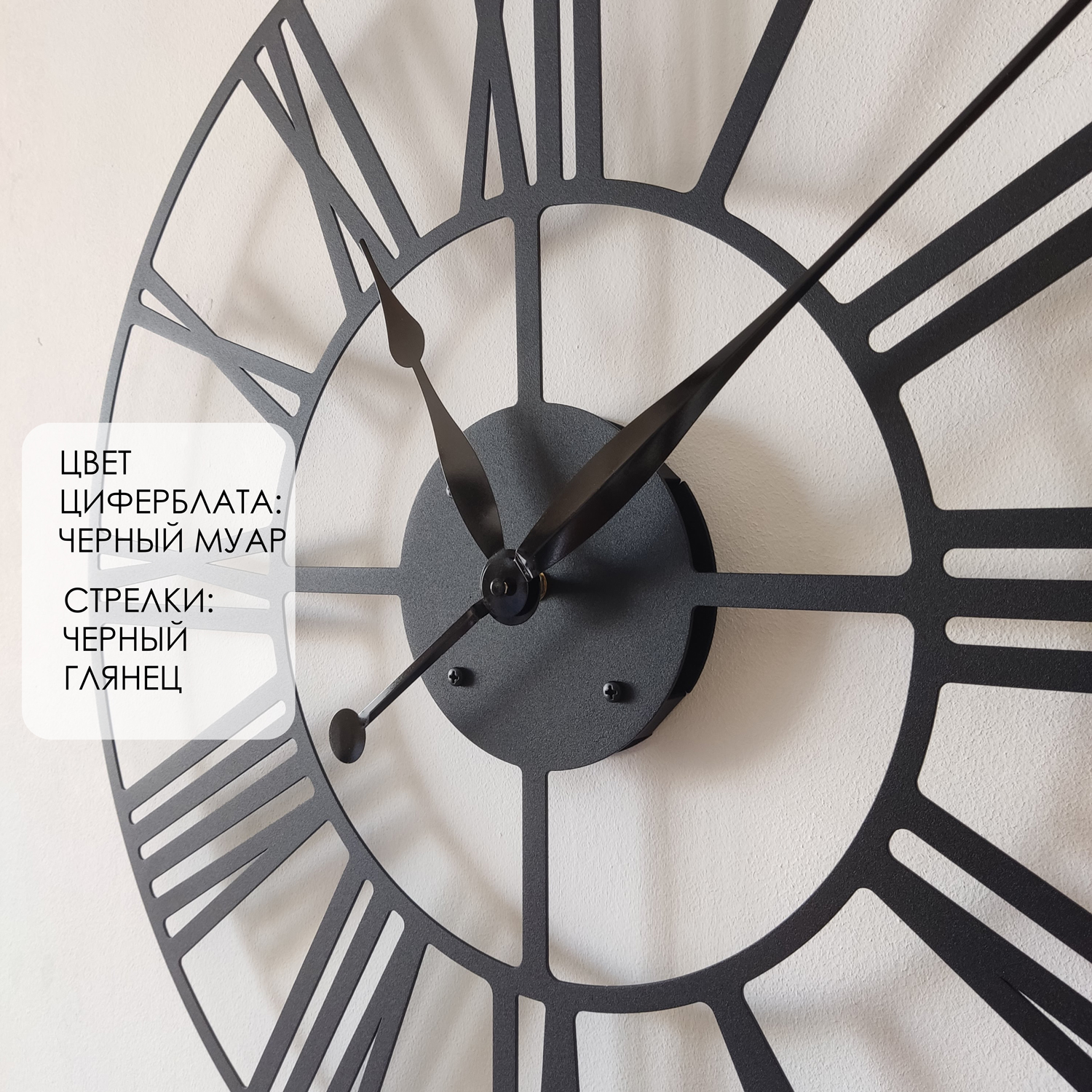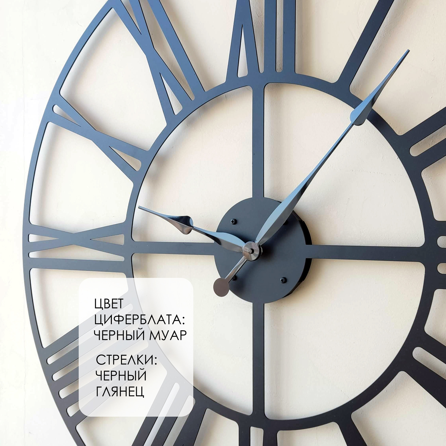 Большие настенные часы из металла Размер: 90х90 см Цвет циферблата: черный муар Цвет стрелок: черный глянец