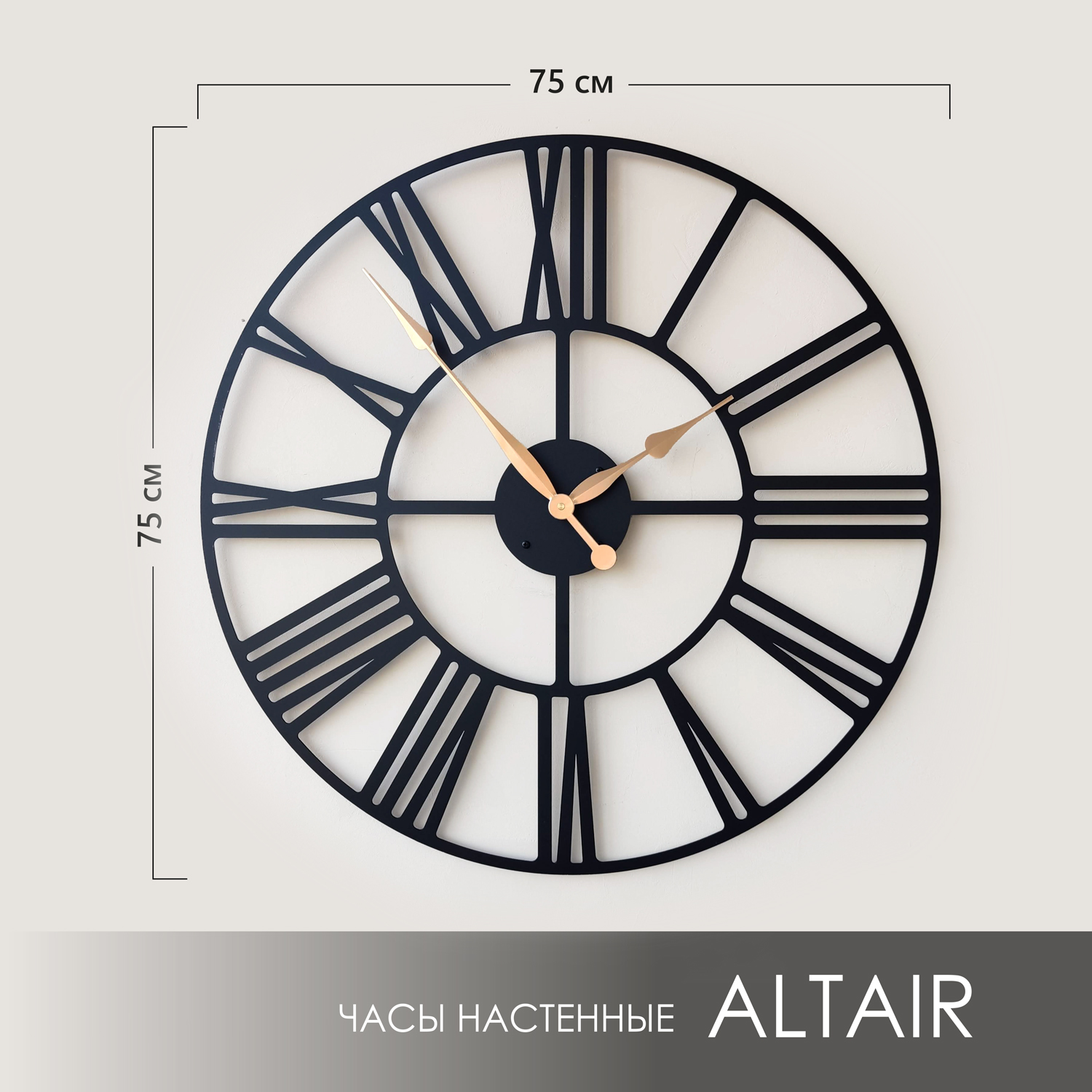 Большие настенные часы из металла Размер: 75х75 см Цвет циферблата: черный муар Цвет стрелок: золото