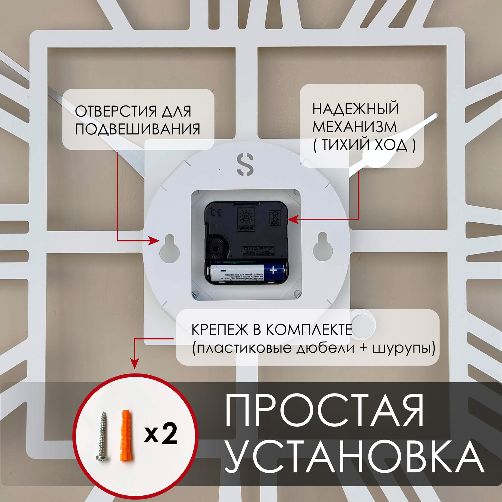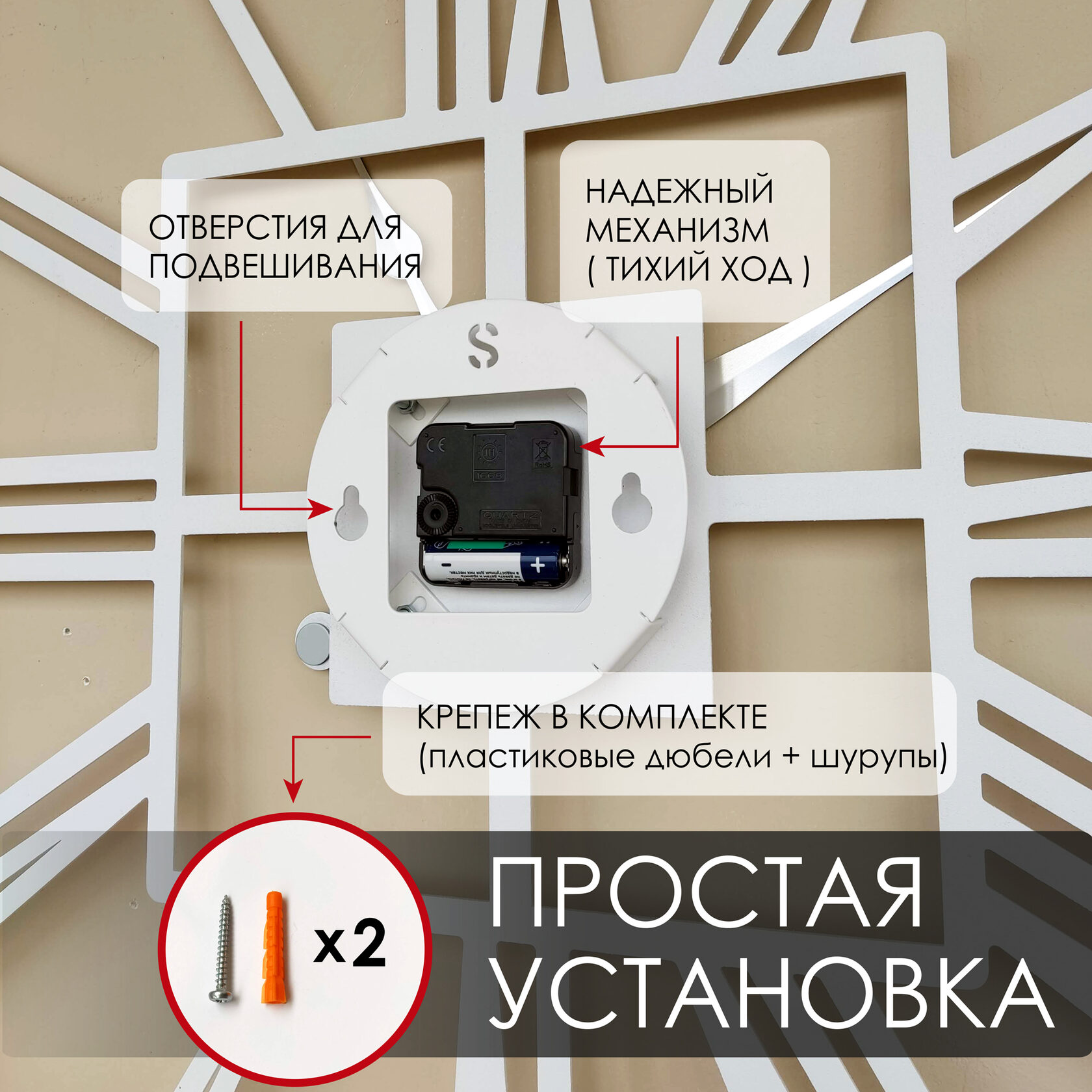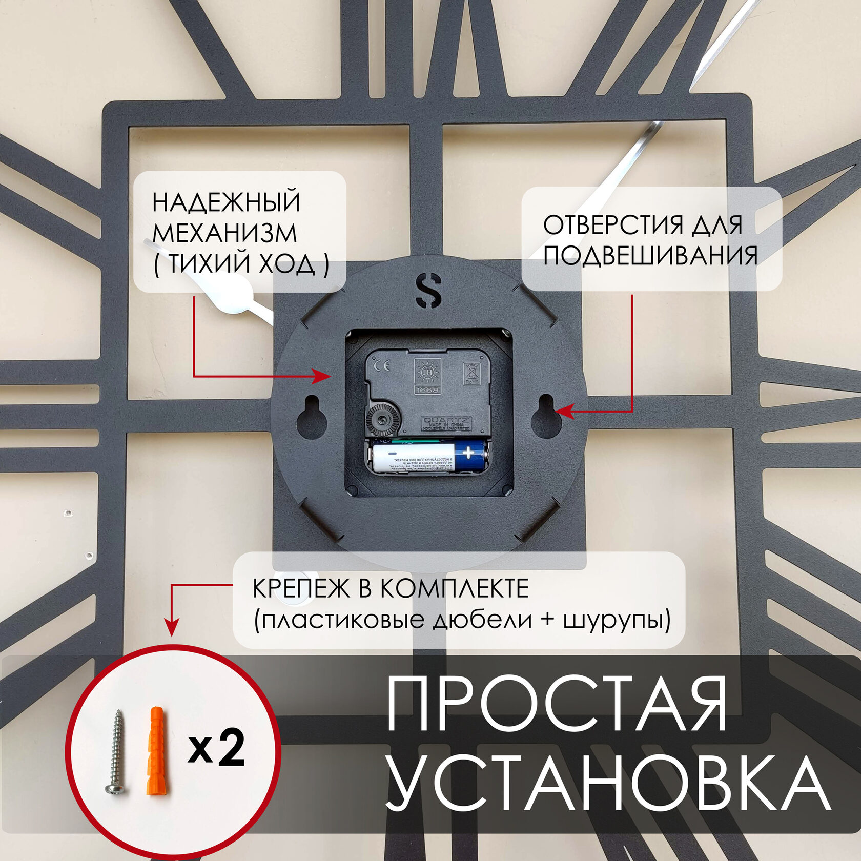 Эти большие настенные часы изготовлены из металла и окрашены экологичной порошковой краской. Они станут стильным домашним предметом интерьера, подчеркивающим красоту пространств, будь то лофт, минимализм, хай-тек, классика, модерн или дизайнерские интерьеры. Необычные большие настенные часы идеально подойдут в качестве подарка. На часах установлен надежный тихий механизм с плавным ходом, работающий от батарейки АА. Все права защищены и принадлежат правообладателю