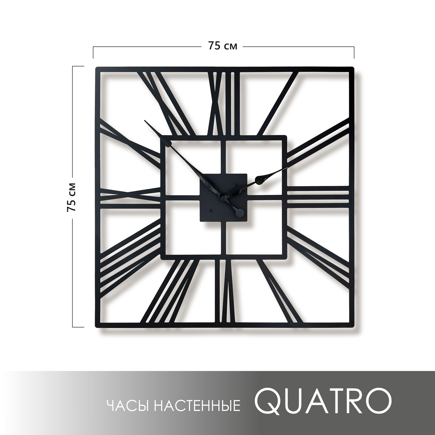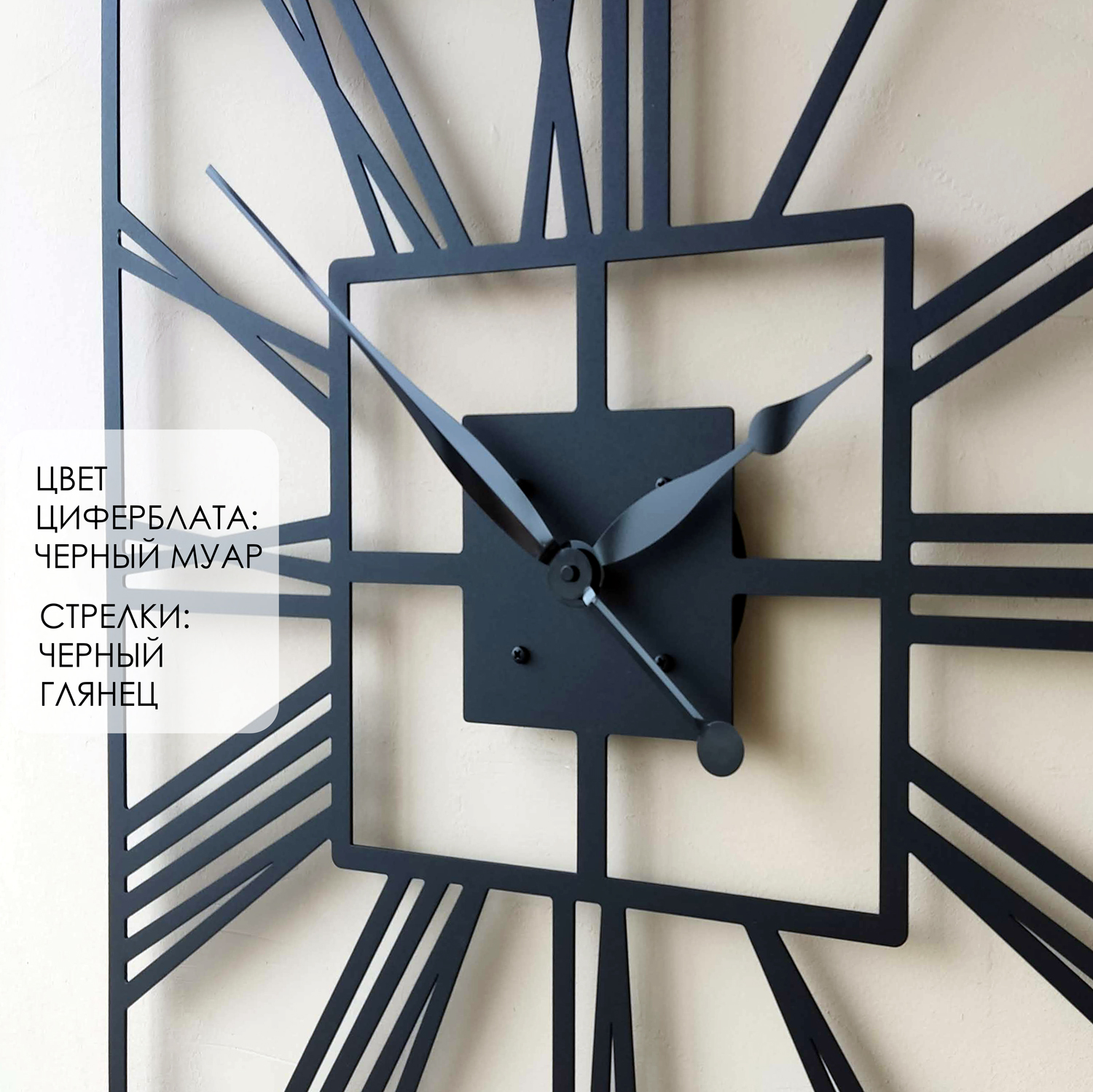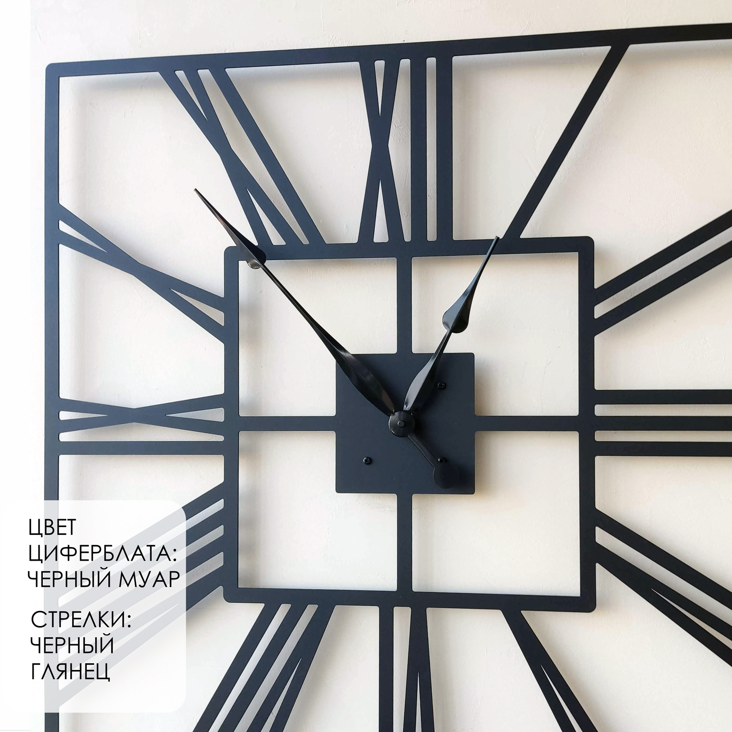 Большие настенные часы из металла Размер 75x75 см Цвет циферблата: черный муар Цвет стрелок: черный глянец