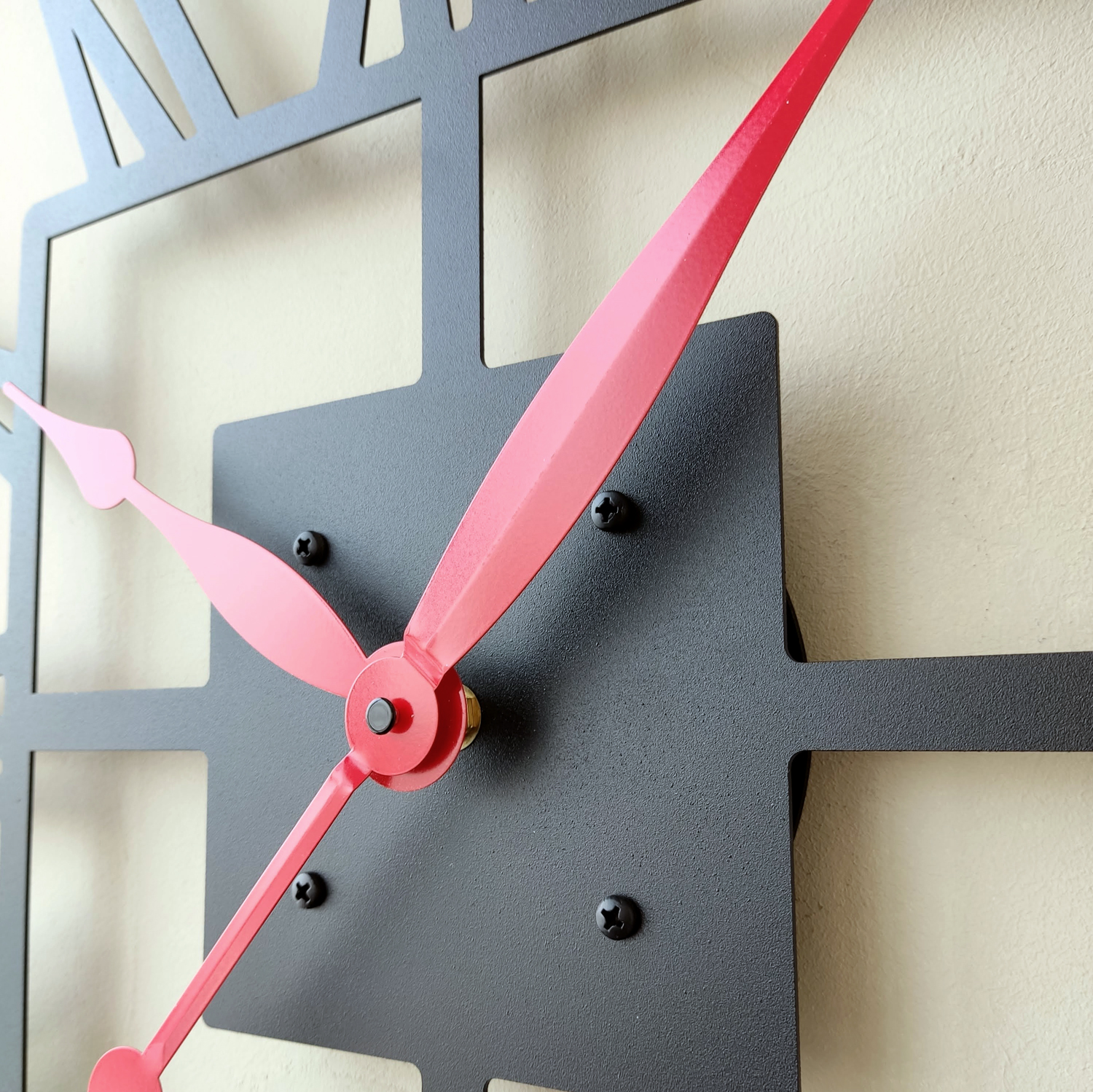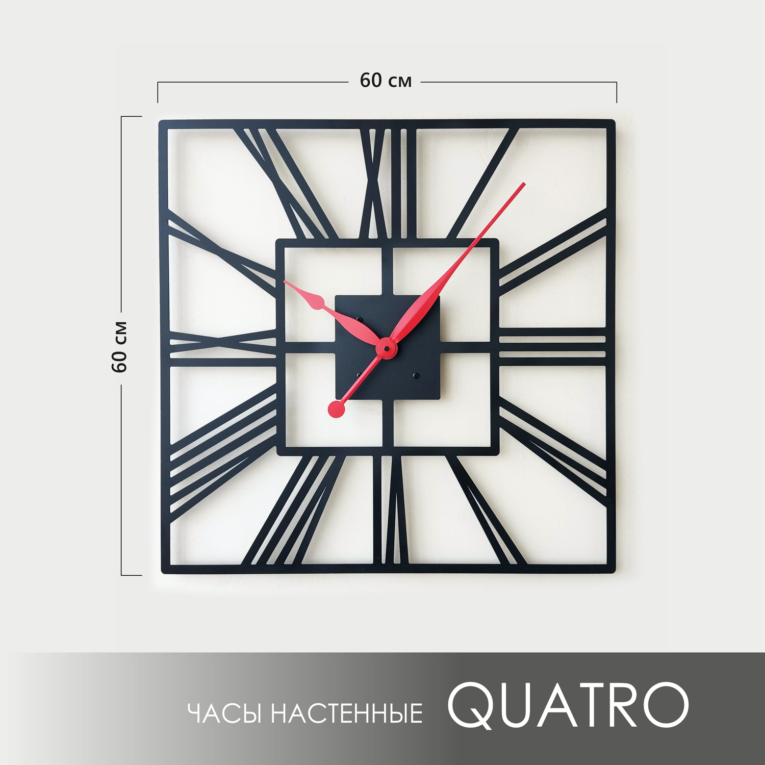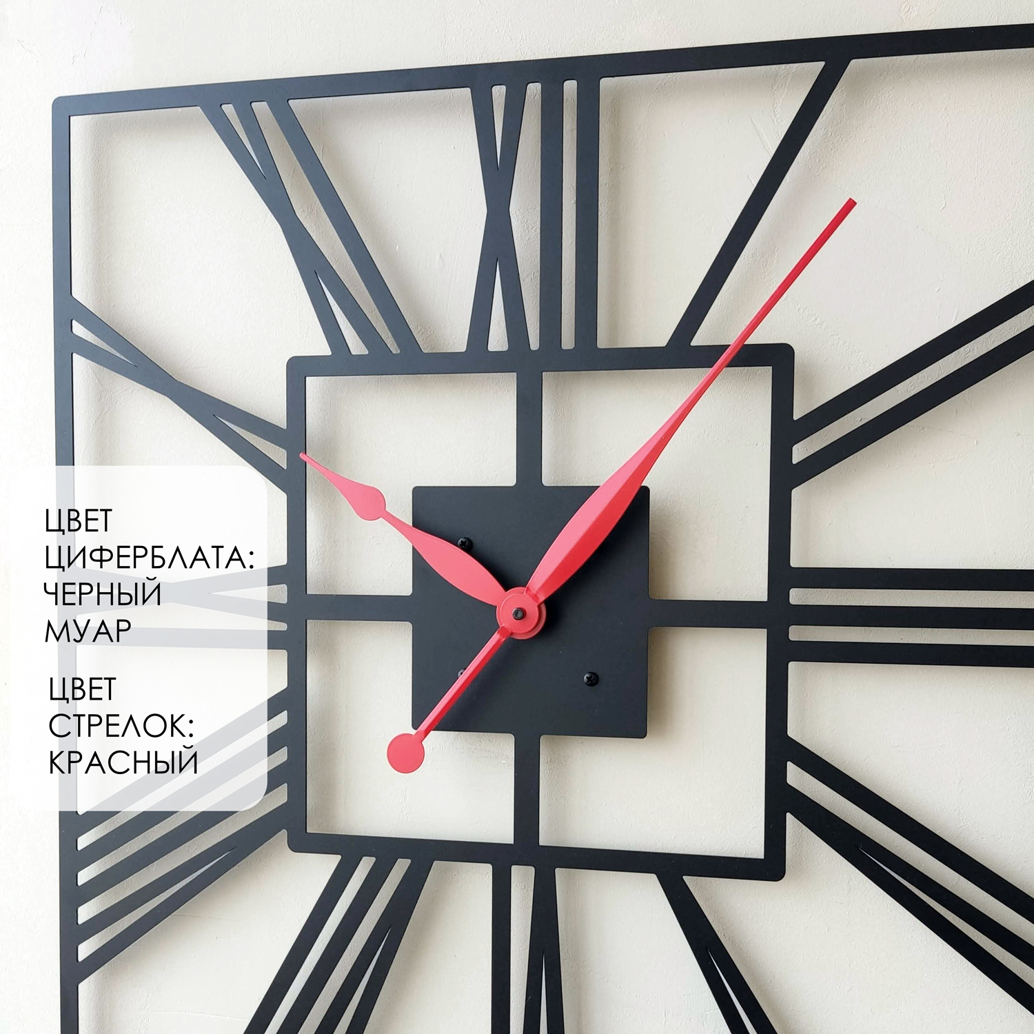 Большие настенные часы из металла Размер 60x60 см Цвет циферблата: черный муар Цвет стрелок: красный