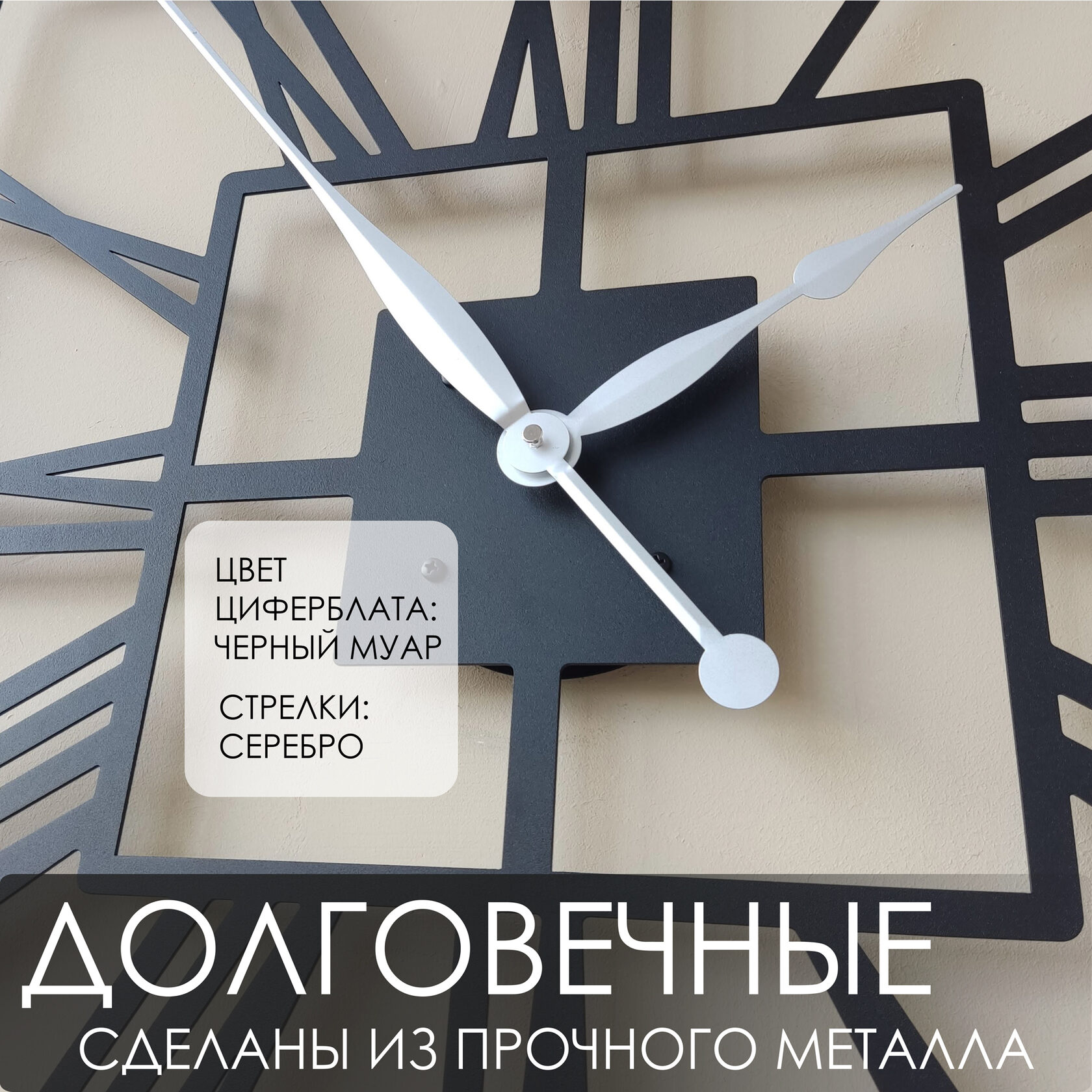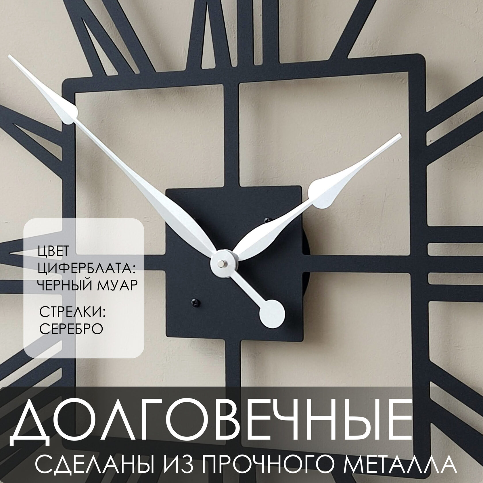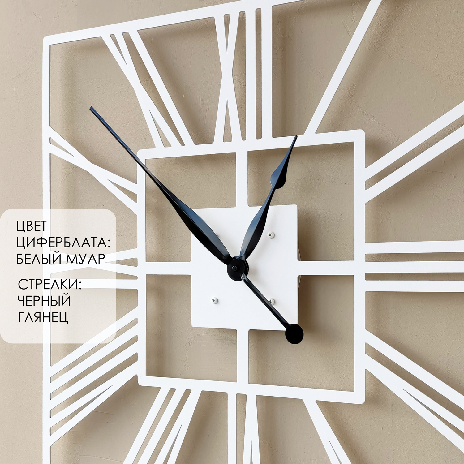 Большие настенные часы из металла Размер 60x60 см Цвет циферблата: белый муар Цвет стрелок: черный глянец