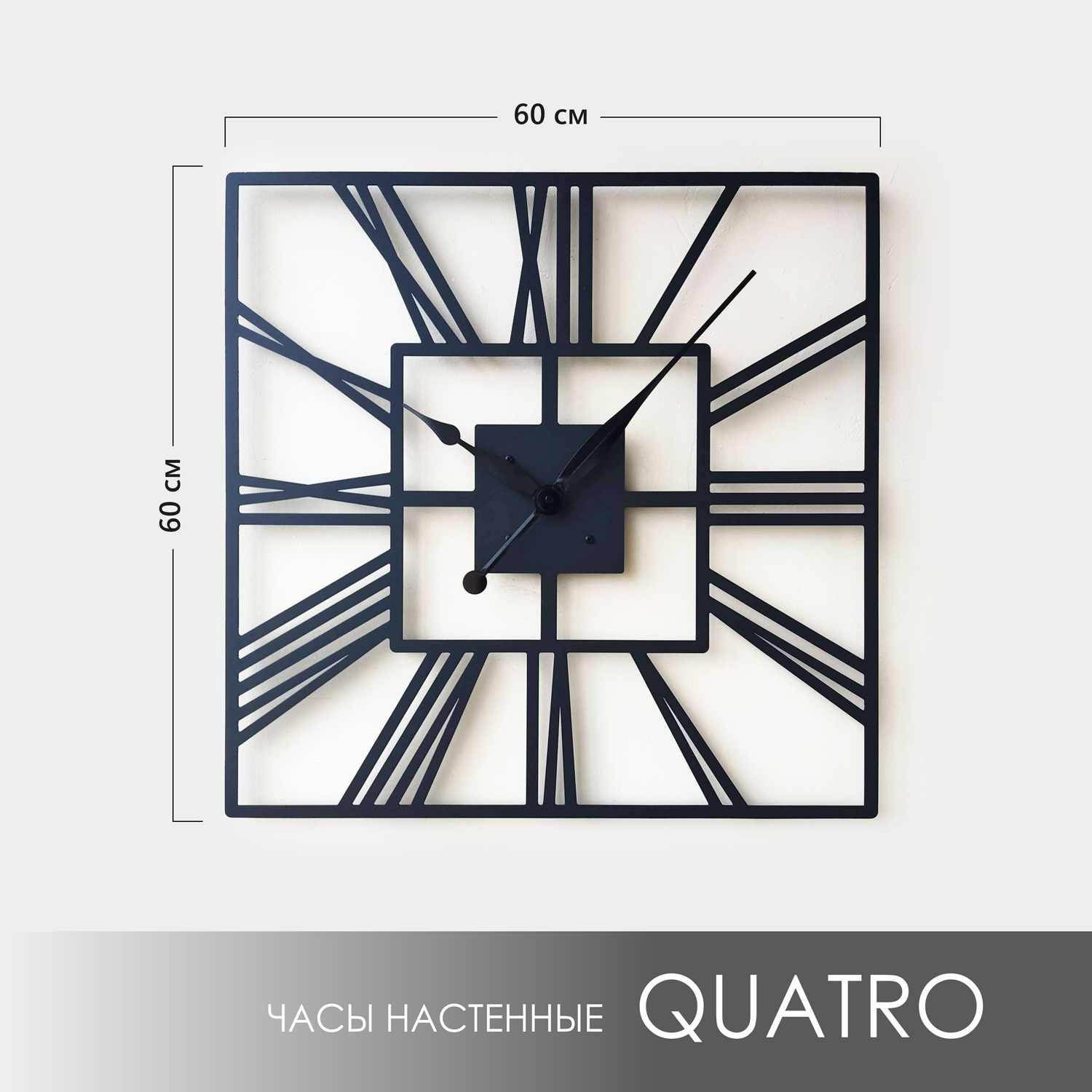 Большие настенные часы из металла Размер 60x60 см Цвет циферблата: черный муар Цвет стрелок: черный глянец