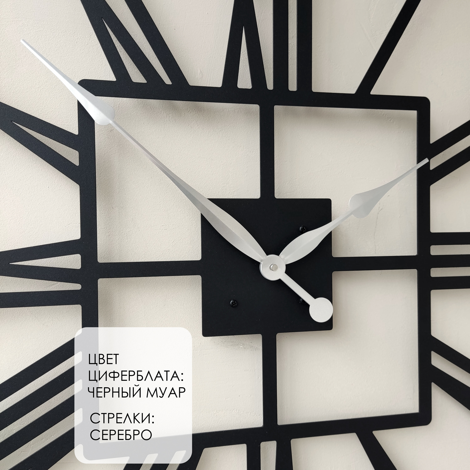 Большие настенные часы из металла Размер 60x60 см Цвет циферблата: черный муар Цвет стрелок: серебро