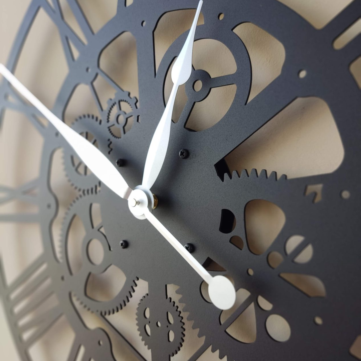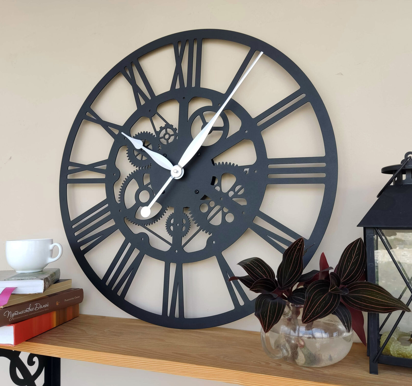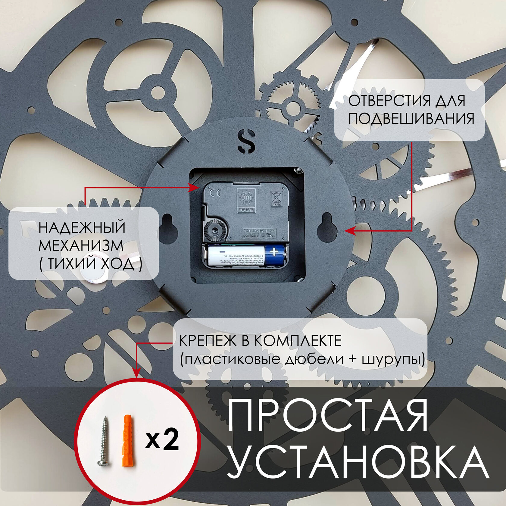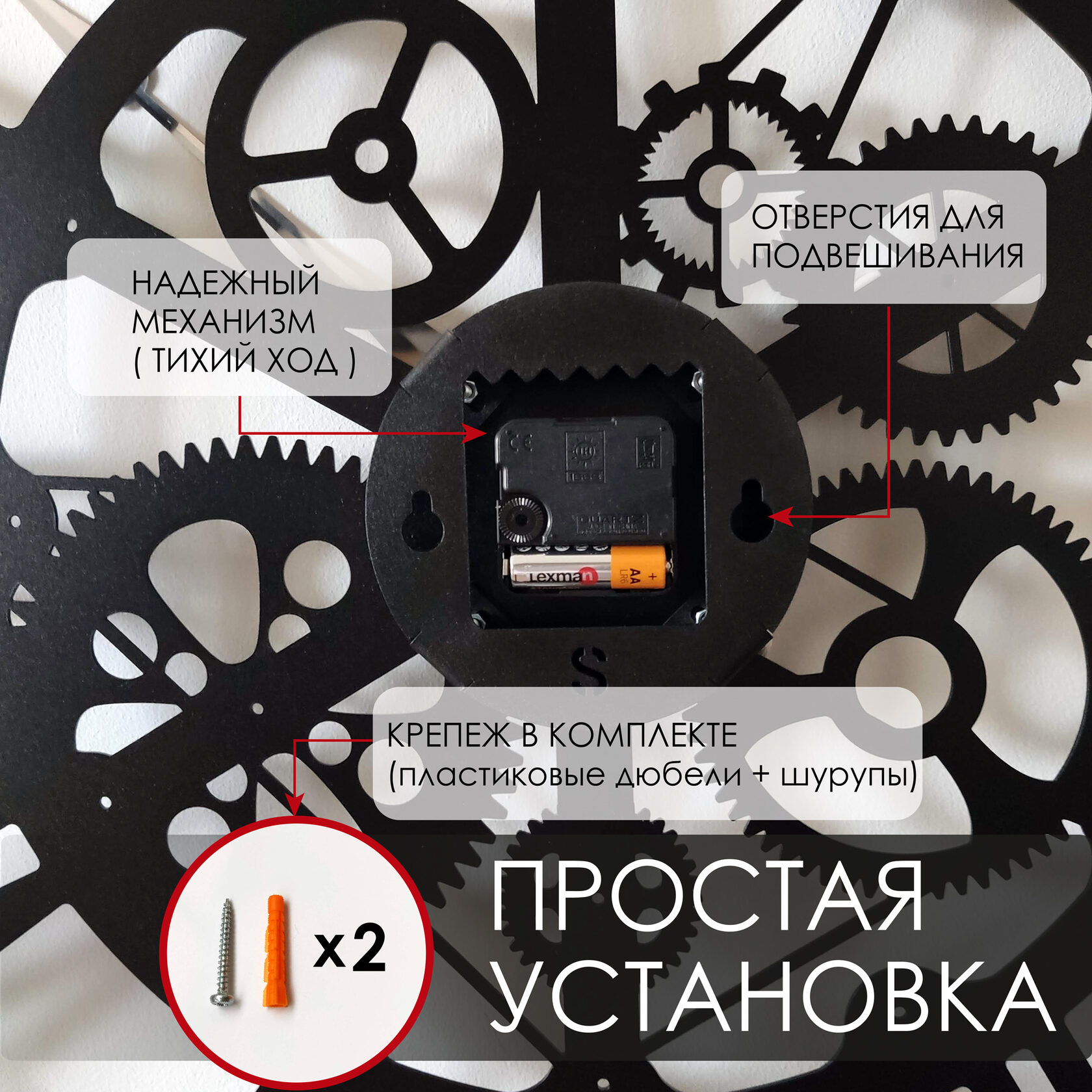 Эти большие настенные часы изготовлены из металла и окрашены экологичной порошковой краской. Они станут стильным домашним предметом интерьера, подчеркивающим красоту пространств, будь то лофт, минимализм, хай-тек, классика, модерн или дизайнерские интерьеры. Необычные большие настенные часы идеально подойдут в качестве подарка. На часах установлен надежный тихий механизм с плавным ходом, работающий от батарейки АА. Все права защищены и принадлежат правообладателю