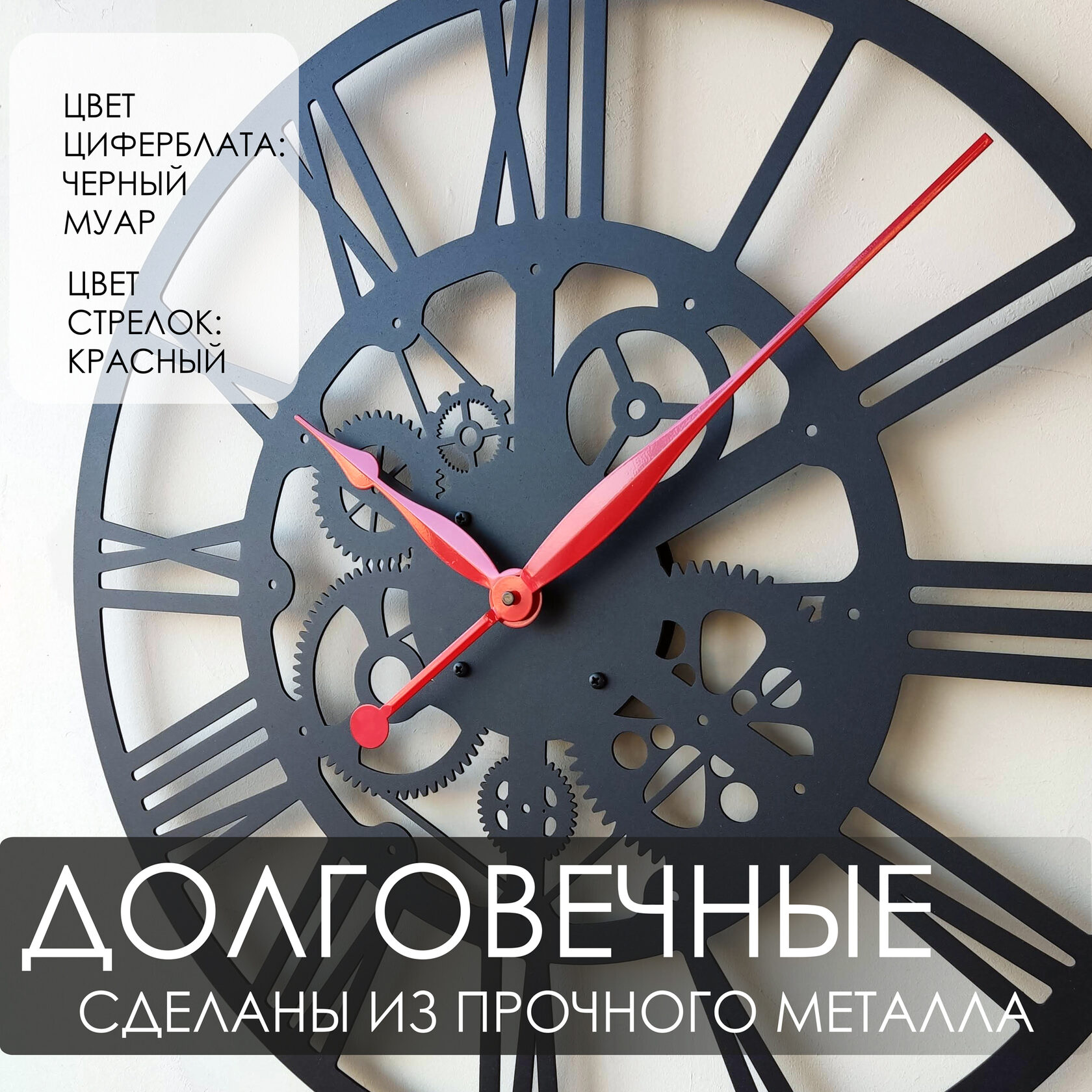 Большие настенные часы из металла Размер 60х60 см Цвет циферблата: черный муар Цвет стрелок: красный
