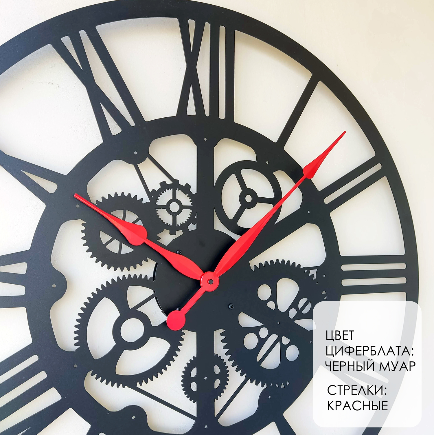 Большие настенные часы из металла Размер 75х75 см Цвет циферблата: черный муар Цвет стрелок: красный
